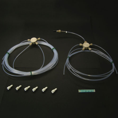 Tubing and fittings to connect 4 lines of the DGU-20A5/A5R to a single LC-20AP. For flow rates up to 80 mL/min with the DGU-20A5 or up to 40 mL/min with the DGU-20A5R. Includes a pre-assembled DGU inlet and outlet manifold with all tubing and fittings. Not for the LC-8A due to the different fitting/ferrule type for the pump inlet.