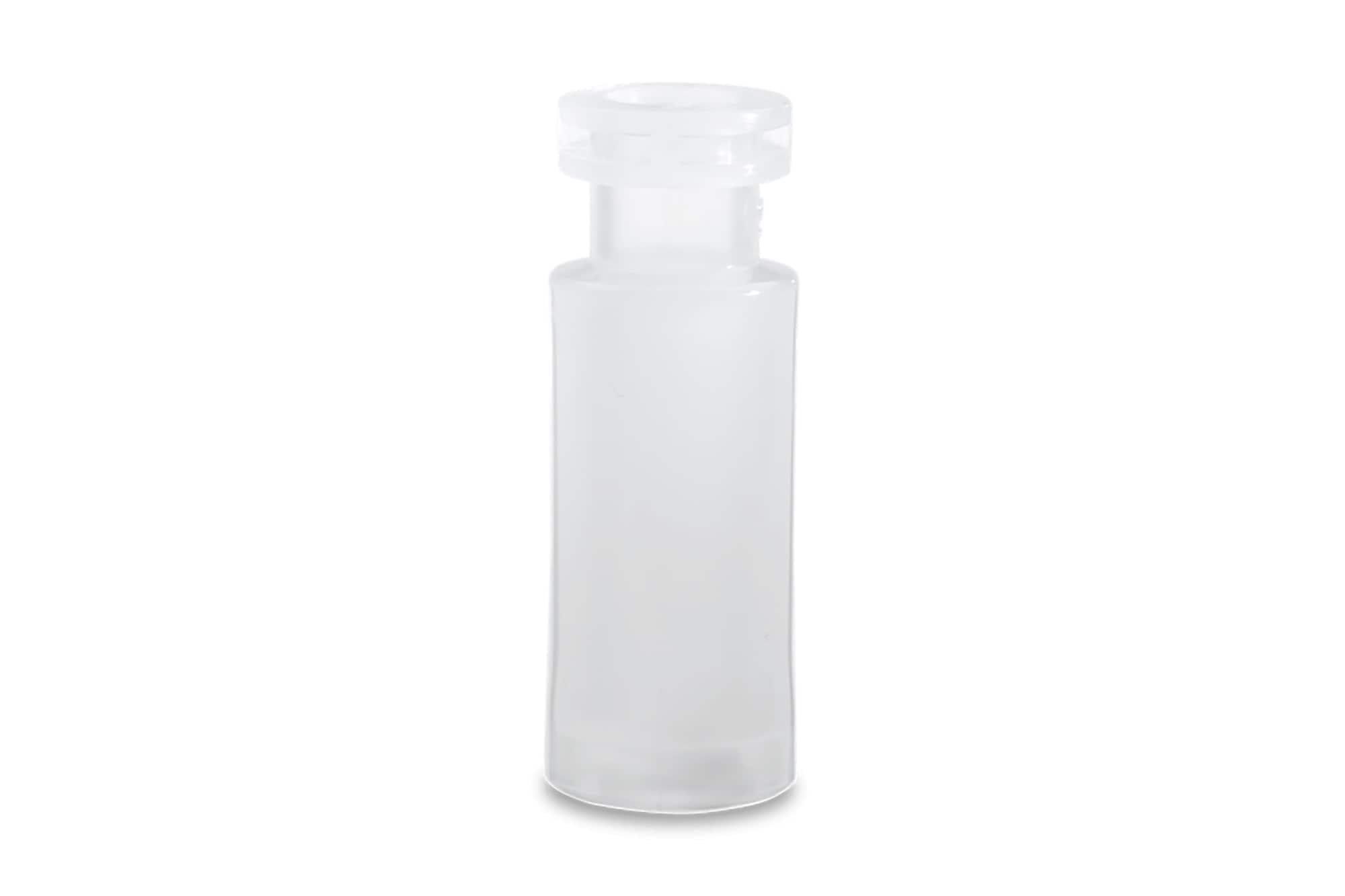Clean polypropylene-molded vial, preferred in applications where there is a concern that compound or molecule may stick to a polar glass surface. This vial is a cost effective alternative to glass.