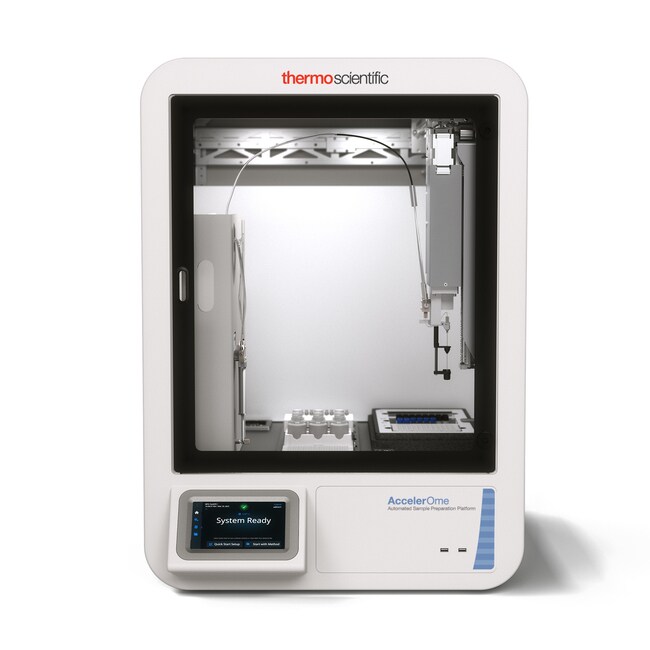 Break free from the long reaction times, high costs, and method complexity of manual proteomic sample preparation with the Thermo Scientific™ AccelerOme™ automated sample preparation platform. With factory-supplied reagents and kits, and step-by-step onscreen instructions, high reproducibility and confident results are delivered for both label-free and Tandem Mass Tag (TMT) multiplexing strategies with minimal effort. The AccelerOme platform is optimized to fit into the Thermo Scientific™ Orbitrap™ mass spectrometer ecosystem, streamlining the entire workflow from sample preparation to data processing.
